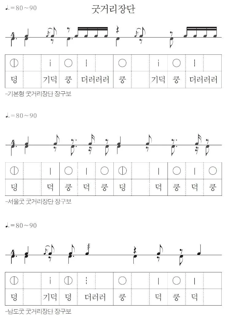 - 특징: 3박 계열의 장단 중 가장 대중 친화적인 리듬입니다. "아리랑"을 비롯한 많은 경기민요가 굿거리장단 위에 얹혀 있어요. 처음 장구를 접하시는 분들이 비교적 편안하게 시작할 수 있는 장단입니다.